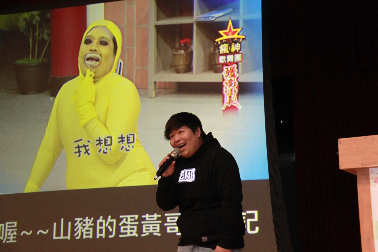 大學時期就是班上的開心果的「山豬」陳俊甫,以「山豬的蛋黃哥奇遇記」為題演講,他說,他剛畢業時,也跟其他同學一樣從事導遊,後來發現志趣不符,才毅然改行,參加明星藝能學員班,不斷精進模仿的實力,也更加了解演藝圈的現實面;「你不要做,很多人排在後面;一旦放棄機會,你就馬上被淘汰了!」。即使他在《全民最大黨》的固定演出時間短暫,甚至不支薪,但那段時間的磨練,「讓我可以在模仿、表演更上一層樓!」