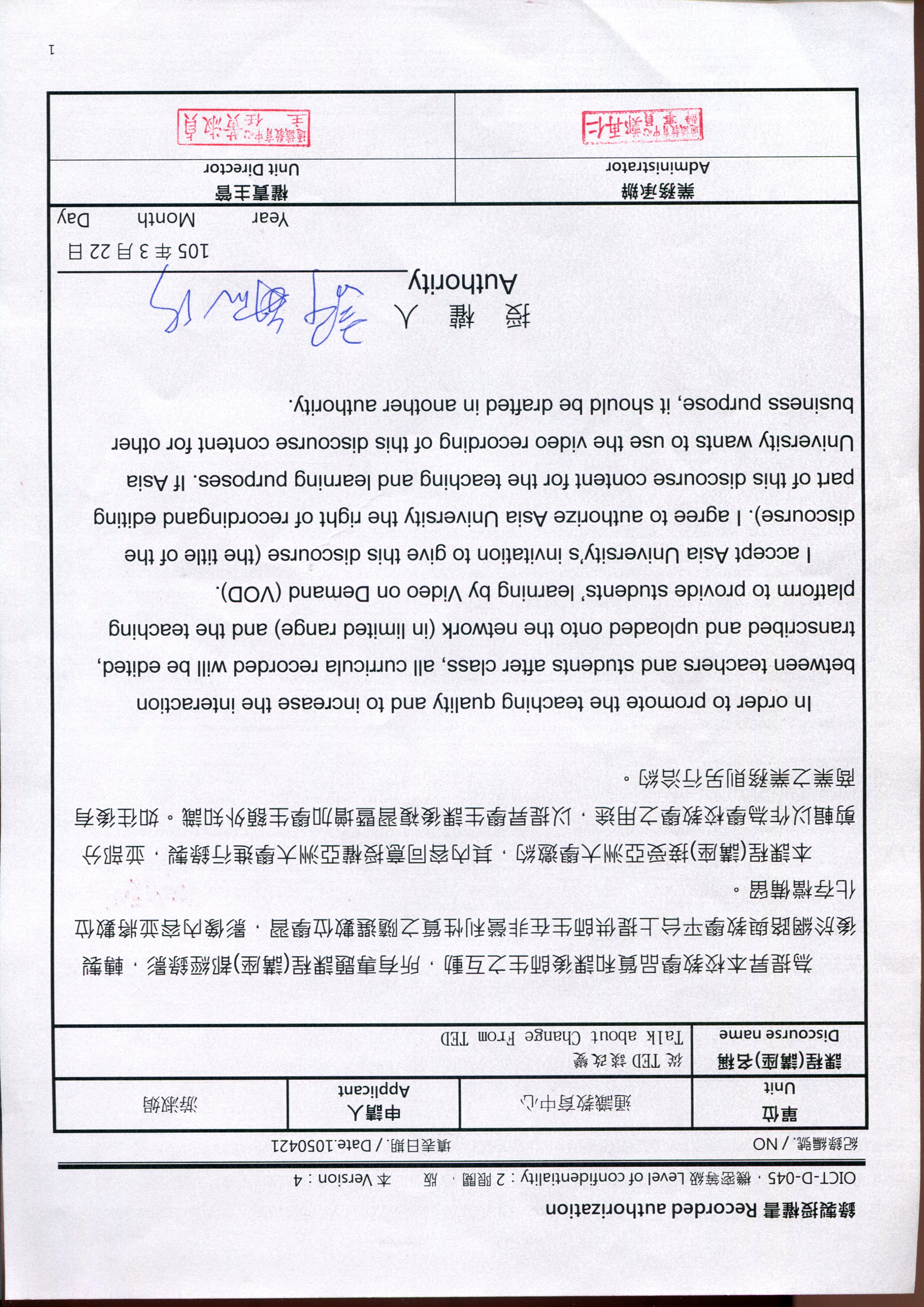從TED(technology, entertainment, design科技,娛樂,設計)談改變」主題,勉勵亞大同學永遠要問對的問題、走自己的路,「全力以赴!」,莫忘初衷!