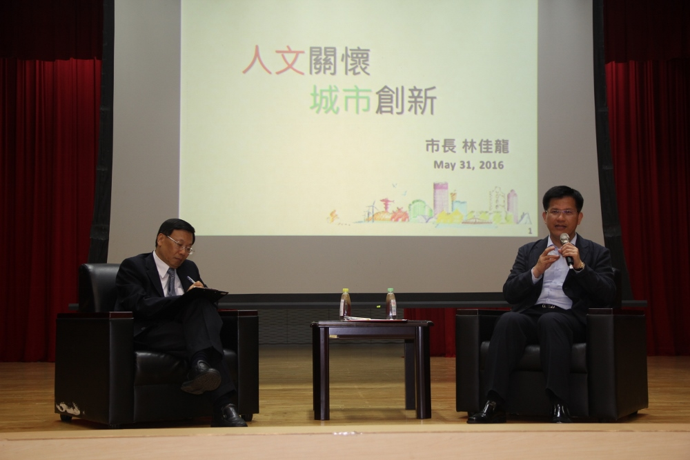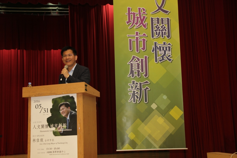 林佳龍市長今天是以「人文關懷、城市創新」為題,他指出,身為領導者,應該是夢想的塑造者、環境的塑造者,城市是人們聚合的地方,共同尋找夢想實現希望,我們希望城市因為人而偉大,他覺得城市一定要以「人」為核心,於是將臺中市定位為「以人為本」的生活首都。