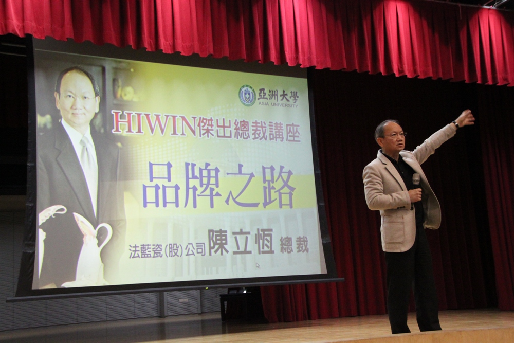 亞洲大學(Asia University, Taiwan)今(10日)天與上銀科技舉辦HIWIN論壇-傑出總裁講座,亞洲大學校長蔡進發、上銀科技總經理蔡惠卿主持,國內文創龍頭品牌法藍瓷總裁陳立恆應邀分享法藍瓷的品牌之路,他說,邁向品牌之路就是要先瞭解自己,再堅持做自己,放大格局,成就他人、也成就自己,並力爭上游爭一口氣,創造生命意義與價值,活出一個有品質、品味、品格的人生。