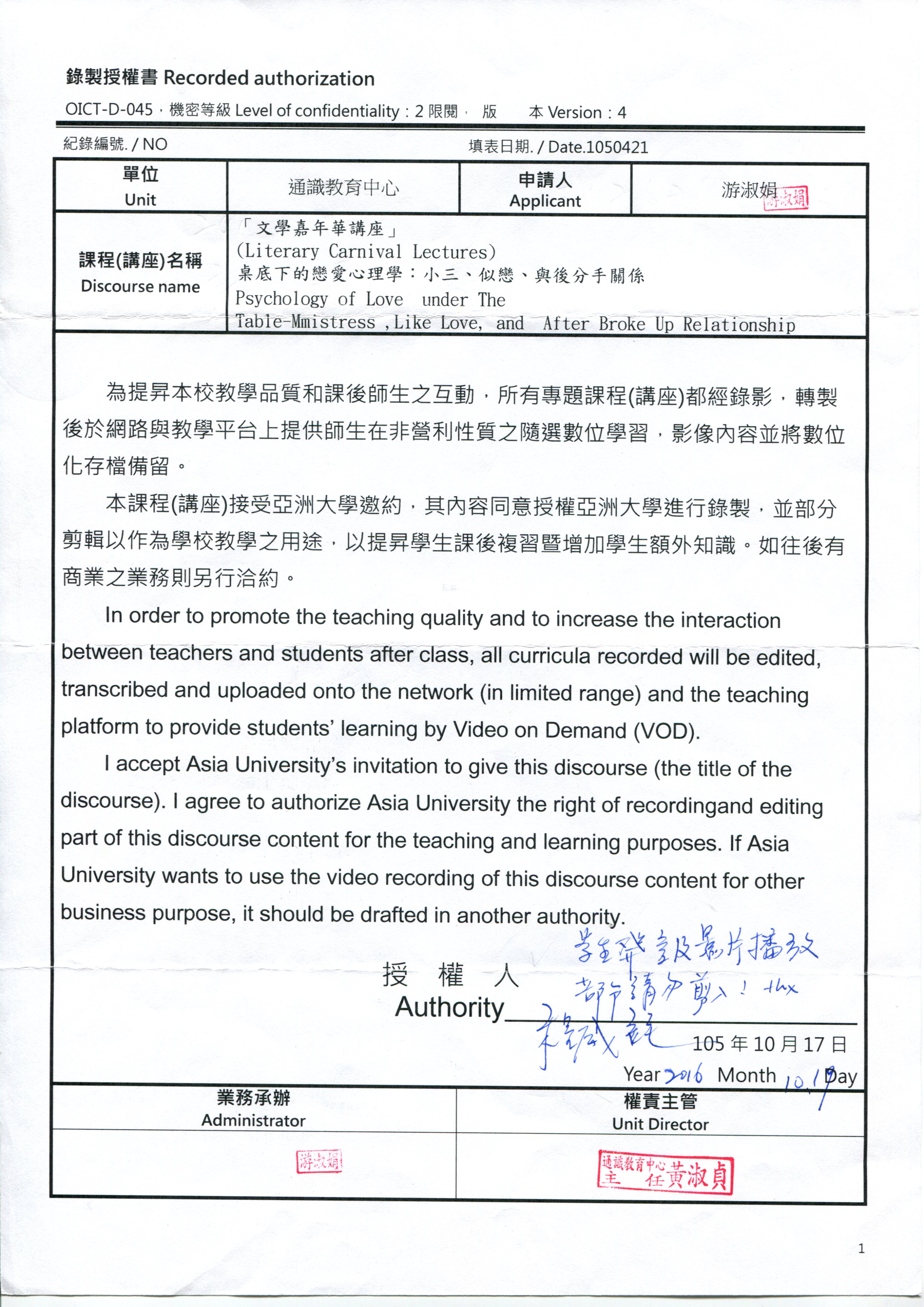 暢銷作家海苔熊以詼諧幽默的口吻、心理學的角度,和學生討論愛情的信任與背叛。海苔熊認為,人會因為寂寞、自信心不足、在不同的人身上看到不同的吸引力等理由,同時愛上兩個以上的人。他也請亞大學生「讀」詩,把詩讀出來,會有不同於單純閱讀的效果,藉由文學的力量,或許能幫助我們在感情問題裡找到安慰和解答。