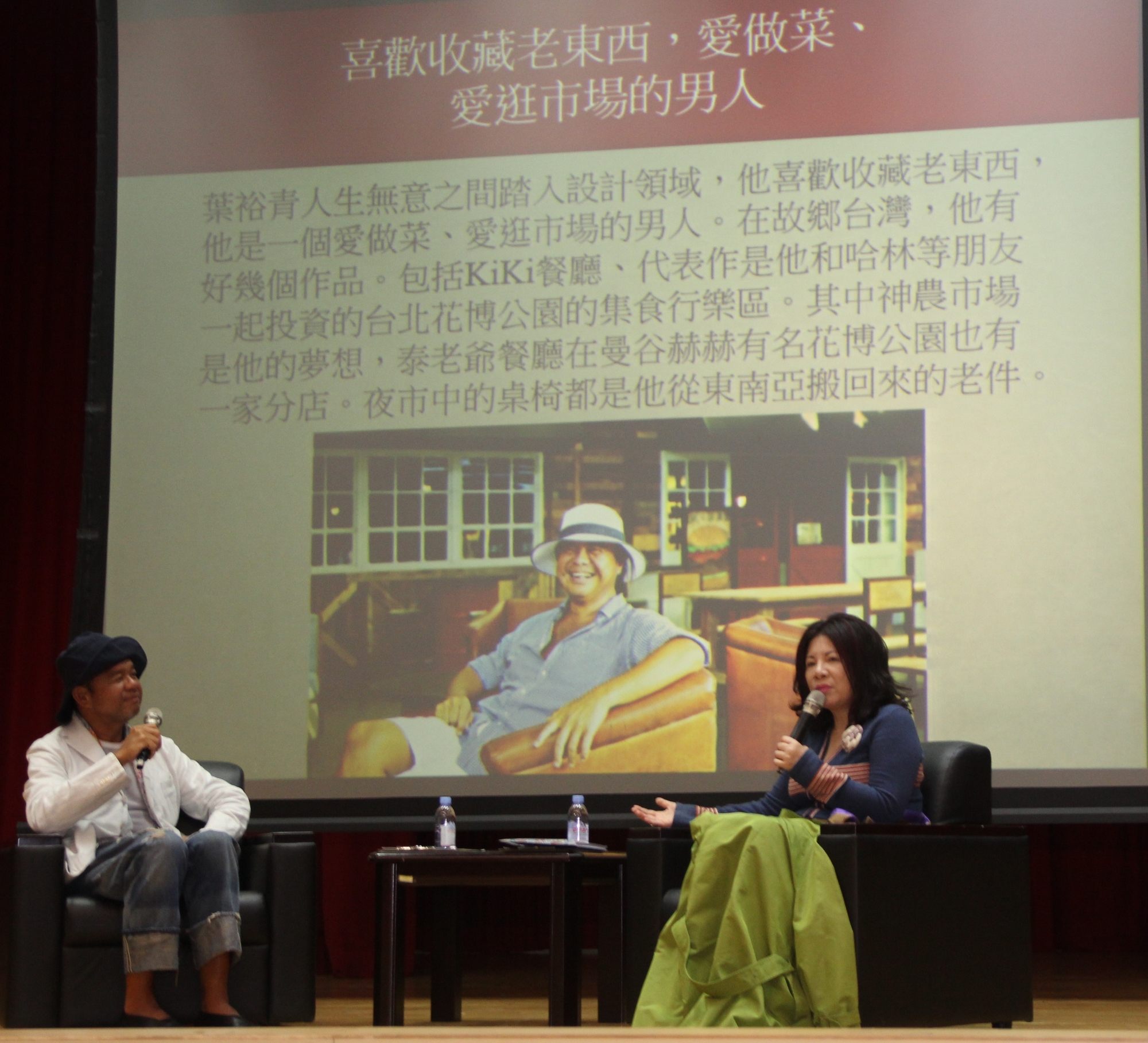 陳文茜教授介紹葉裕青是「周遊列國的室內設計師」,從11歲開始和童子軍出訪新加玻、挪威、日本和歐洲各國,之後又到處旅行、吃美食,日子過得慵 懶又愜意;他又是個「喜歡收藏老東西、愛做菜、愛逛市場的男人」,他在無意間踏入設計領域,在台灣,他有好幾個作品,包括KiKi餐廳、代表作是他和哈林等朋友一起投資的台北花博公園的集食行樂區。其中「神農市場」是他的夢想,泰老爺餐廳在曼谷赫赫有名,花博公園也有一家分店,夜市中的桌椅都是他從東南亞搬回來的老伴。