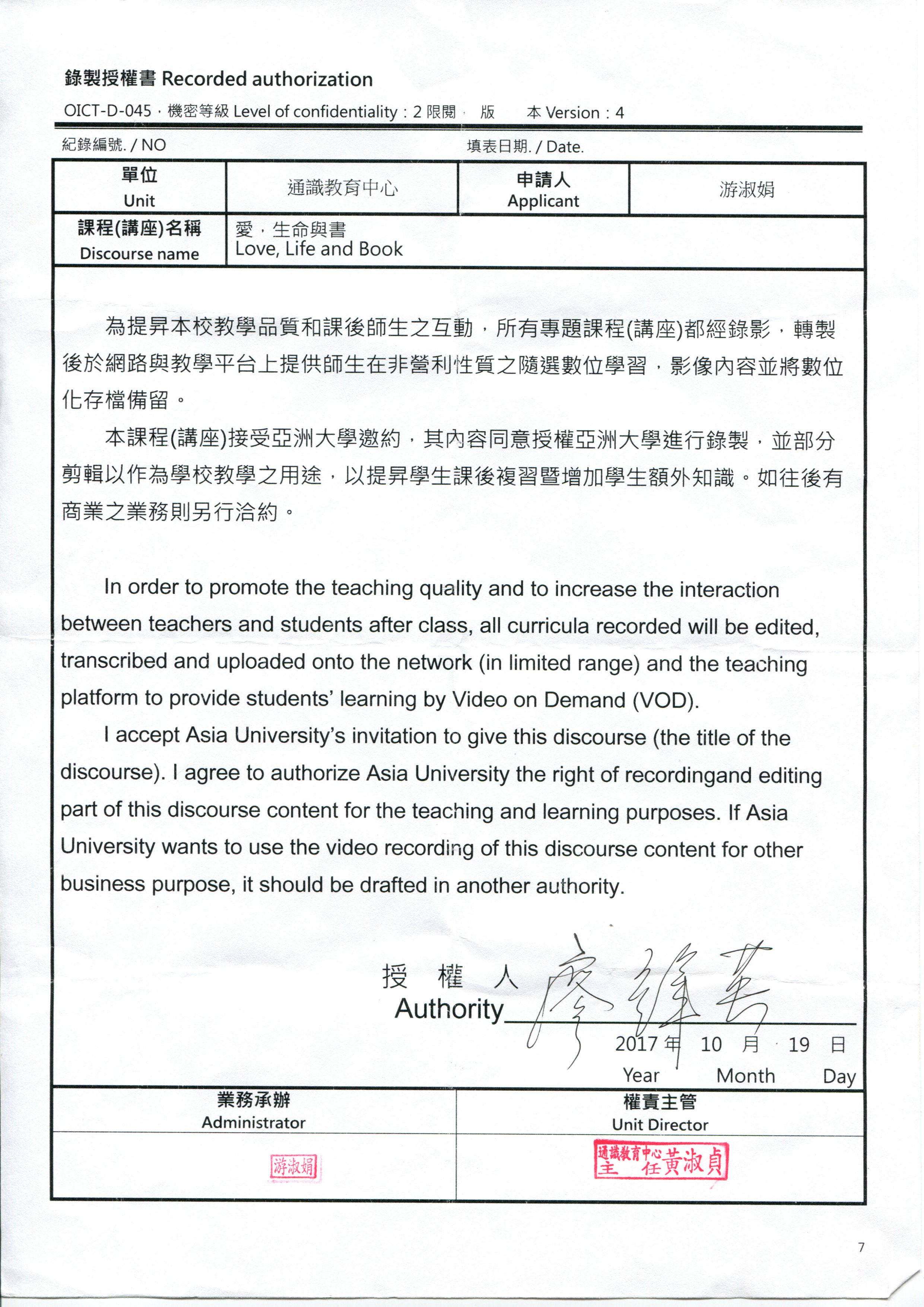 亞洲大學(Asia University, Taiwan)通識中心10月19日結合亞大「文學嘉年華」與台中市文化局「百師入學」講座,邀請台中在地知名作家廖輝英老師,主講「愛,生命與書」。廖輝英老師強調「愛」的重要性,如果生活沒有愛,就沒有豐富的人生;如果人人都沒有愛,就沒有能同情他人的社會。