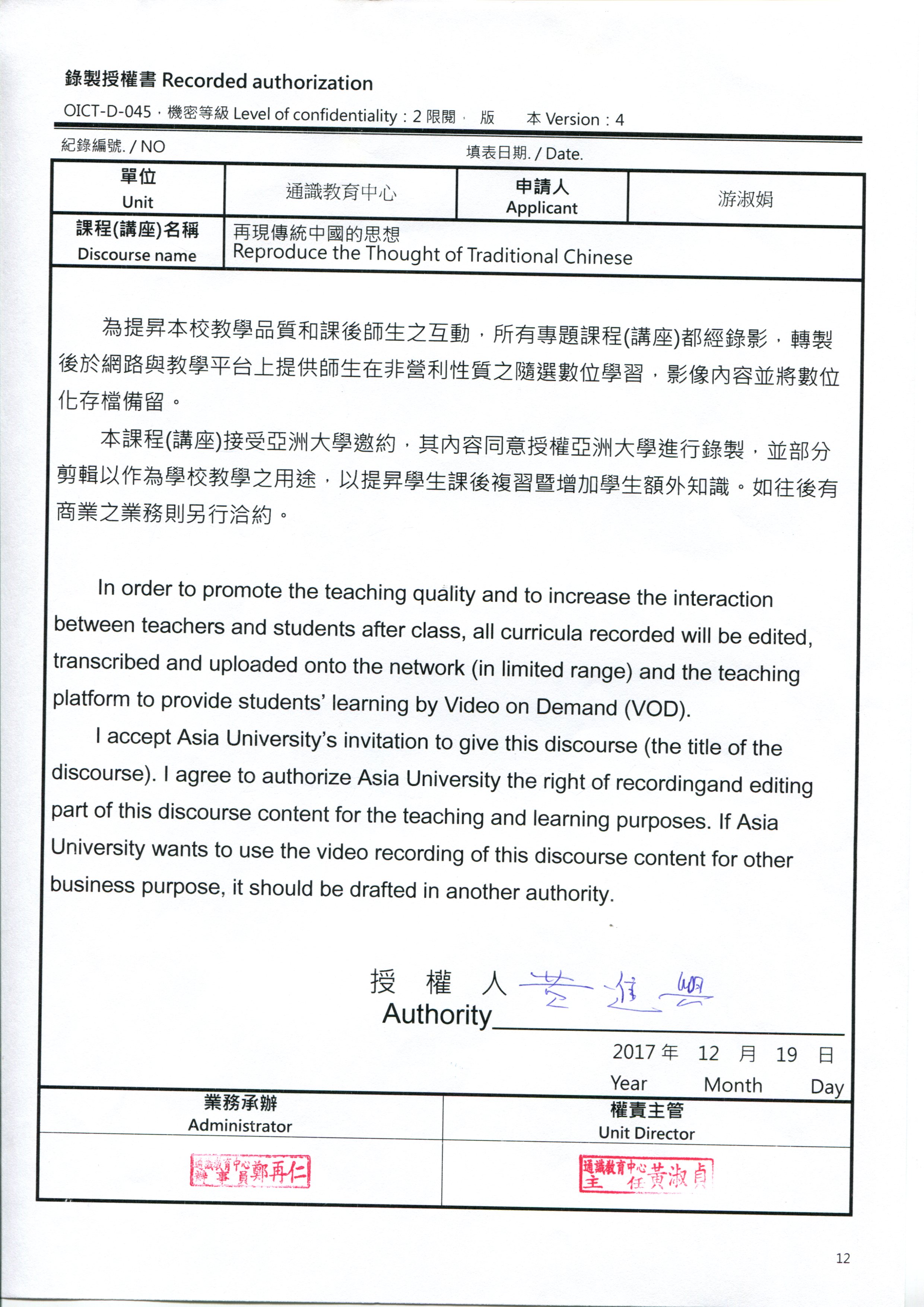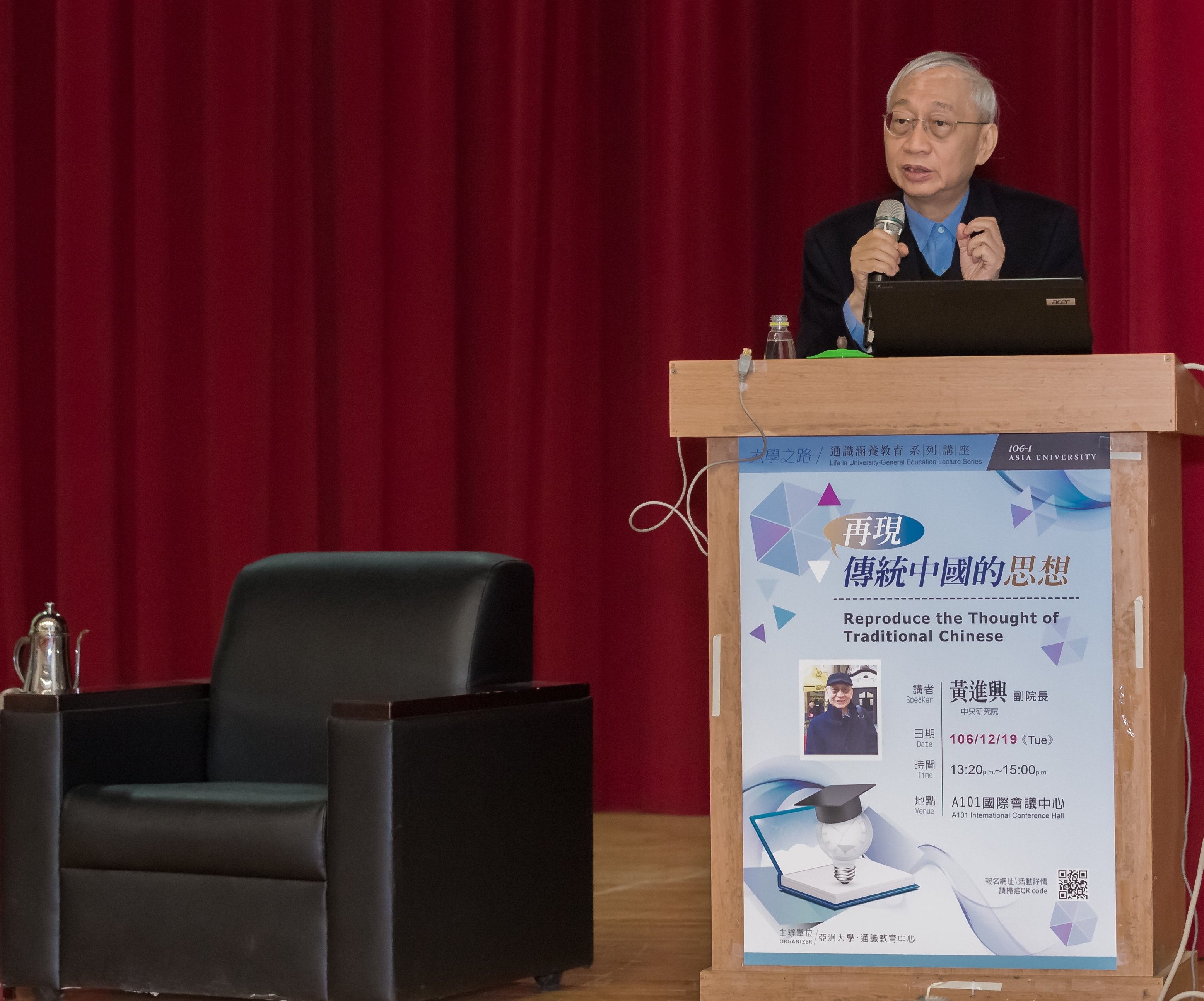 亞洲大學(Asia University, Taiwan)通識教育中心舉辦「大學之路─通識涵養教育系列講座」,12月19日邀請中央研究院院士黃進興,以「再現傳統中國的思想」為題演講。黃進興院士說,偉大的哲學家,往往也是一個生活實踐家;讀哲學的方法不是拿西方思想解釋東方哲學,也不該將東西方哲學放在一起比較高低優劣,而是在生活中找到一條通往智慧的路。