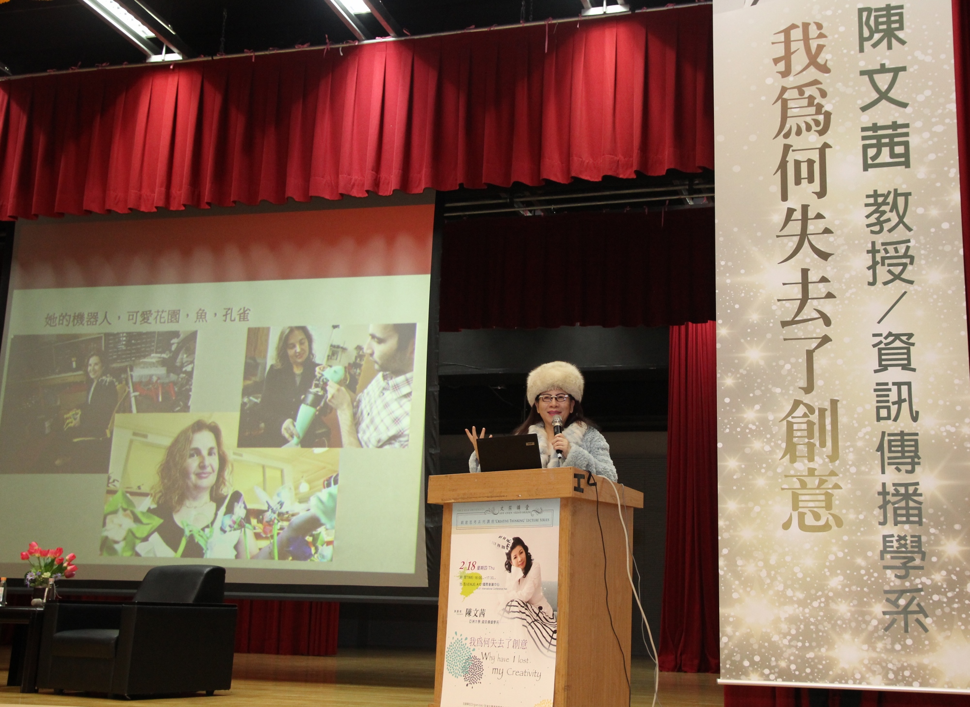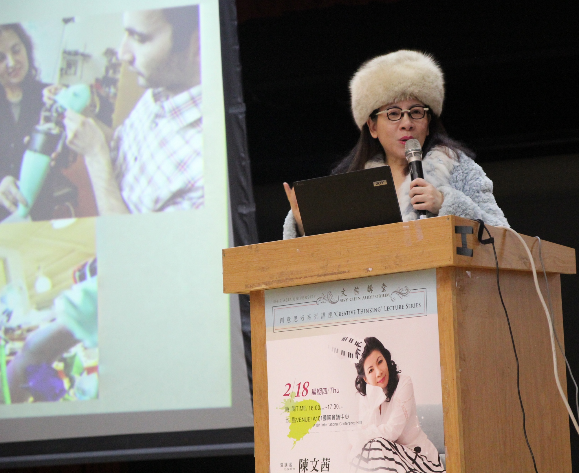 知名主持人、亞洲大學資傳系教授陳文茜這學期在亞大開設「創意思考」系列講座,開學第一堂課,主講:「我為何失去了創意?」,陳文茜教授說,創意,就是與眾不同,還要有獨立思考、永遠要相信自己,即使處於孤獨,甚至有時候是貧窮的,也能提出創意;她期許同學要從不一樣的環境之中,創造源源不絕的發想。