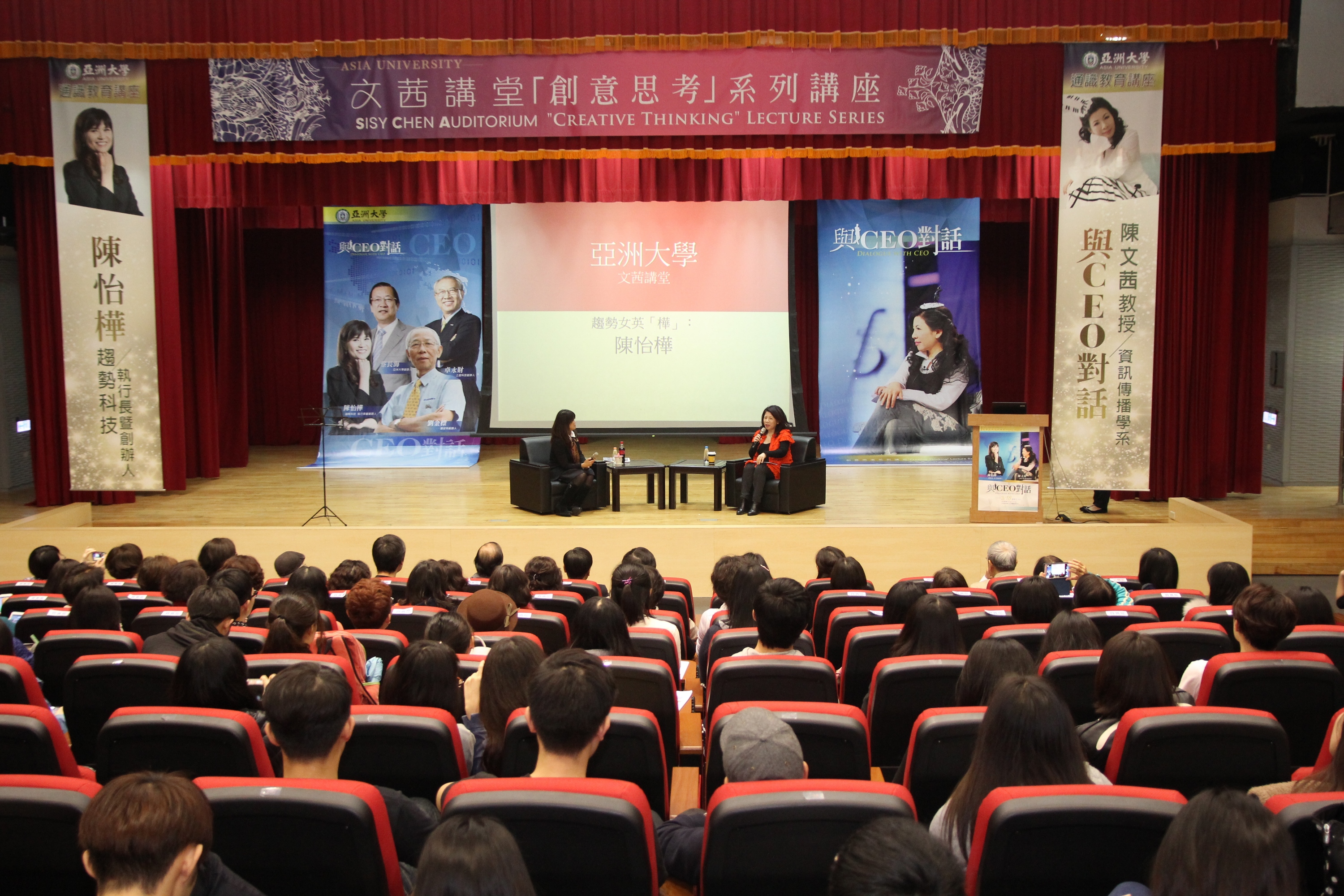 知名主持人、亞洲大學(Asia University, Taiwan)資訊傳播系教授陳文茜在「創意思考」系列講座,與趨勢科技執行長暨創辦人陳怡樺對談,陳怡樺執行長勉勵亞大同學克服自己恐懼,邁向成功人生,用心創造產業價值,讓所有跟你工作的人感到驕傲,「至於創新,不妨換個角度去思考,相信會有不一樣的結果!」