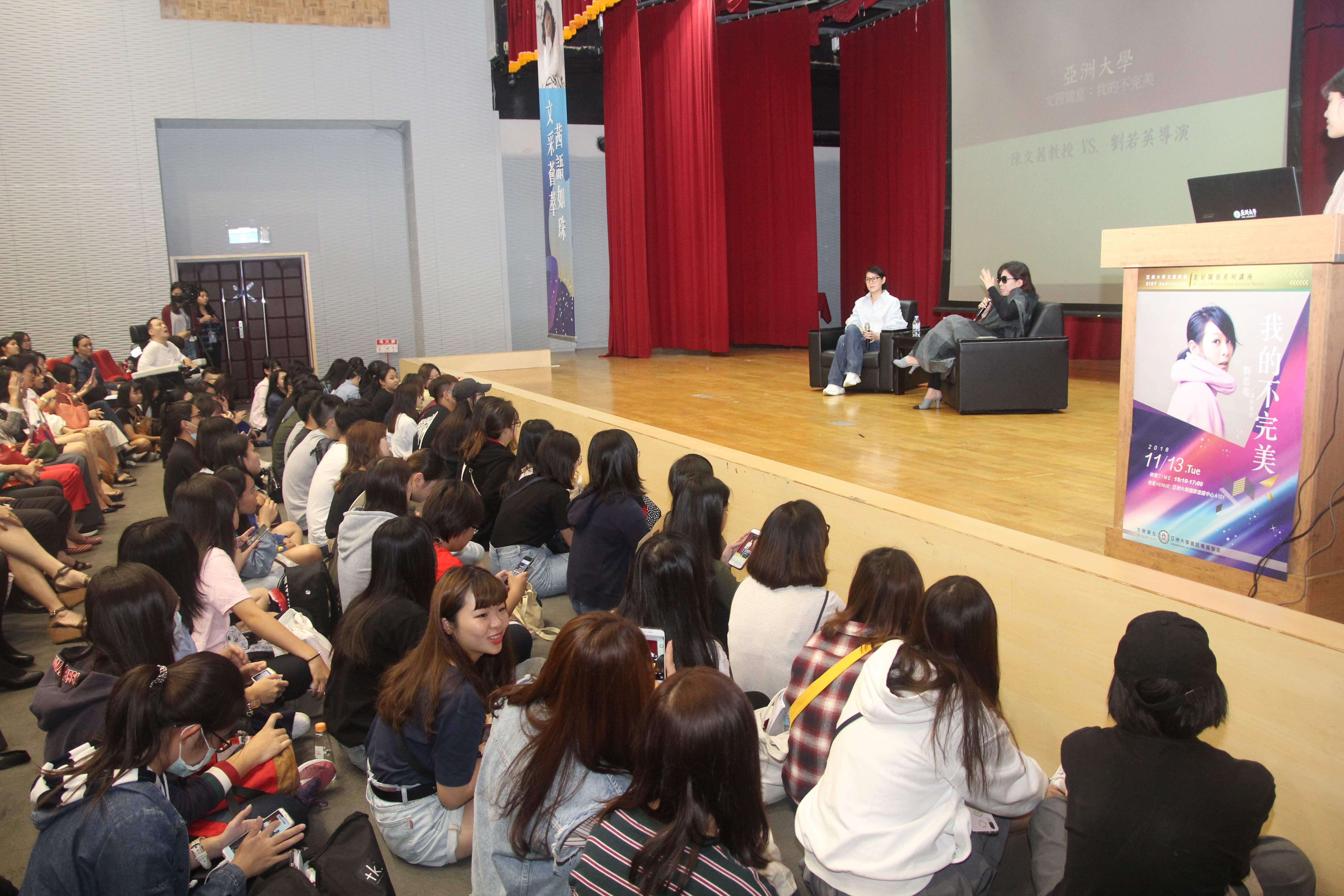 知名媒體人、亞洲大學(Asia University, Taiwan)講座教授陳文茜11月13日下午在亞大「文茜講堂-美好關係」系列講座,與電影導演、知名歌手劉若英對談,主題是「我的不完美」。劉若英告訴亞大同學從事任何創作,會選擇與觀眾站在一起,懂得他們的心情,跟他們對話,永遠要保持初心、好奇及新鮮態度,才能成就一番事業。